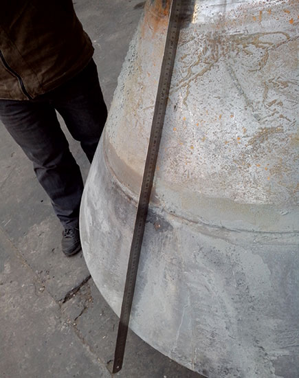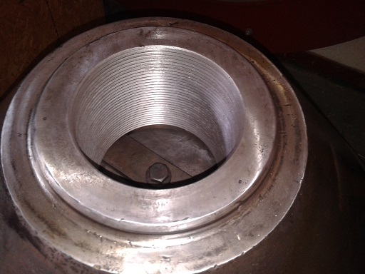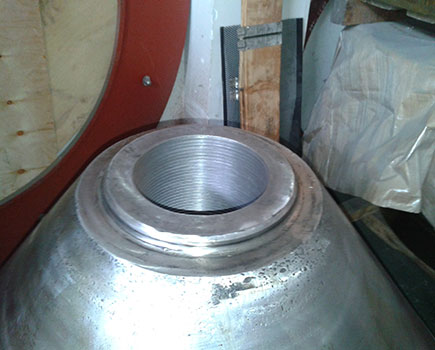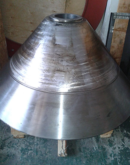 客戶HP500 破碎機(jī)動(dòng)錐體在更換襯板時(shí)發(fā)現(xiàn)鎖緊螺栓不能拆卸,運(yùn)到我公司維修。由我司技術(shù)人員判定為動(dòng)錐體內(nèi)螺紋損壞,同時(shí)檢查動(dòng)錐體外錐面,發(fā)現(xiàn)磨損嚴(yán)重。
